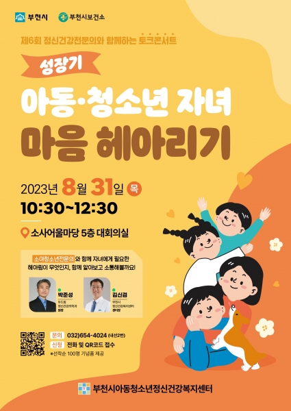 부천시에서 주최하고 부천시아동청소년정신건강복지센터가 주관하는 ‘제6회 정신건강전문의와 함께하는 토크콘서트’는 ‘성장기 아동·청소년 자녀 마음 헤아리기’를 주제로 부천시민 누구나 참여할 수 있다.