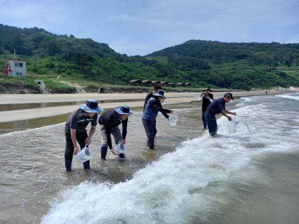 [금요저널] 옹진군은 지난 3일 서해5도 수산자원 회복을 목적으로 대청도 지두리 해변에서 관련 공무원, 어촌계장, 지역어업인 등 약 20명이 참석한 가운데, 얕은 수심의 모래가 많은 해역에 주로 서식하는 꽃게의 특성을 고려한 어린 꽃게 약 40만 마리를 방류했다고 밝혔다.