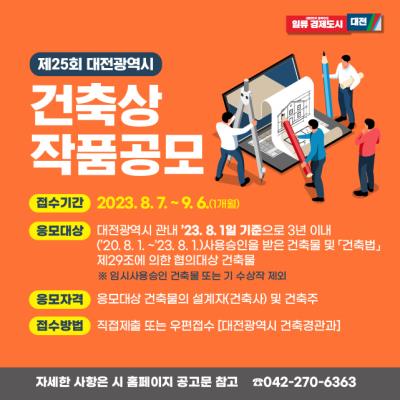 금상 1, 은상 1, 동상 2 등 총 4작품을 선정하고 오는 10월 말에 열리는‘2023년 제15회 대전건축문화제’에서 시상하고 작품을 전시한다.