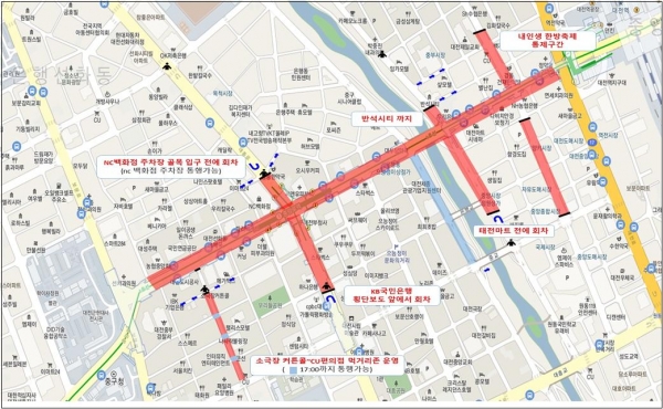 또한 전면 통제구간·주요 행사구간·버스 우회도로 구간에 차량 불법 주·정차를 전면 금지하고 타슈·킥보드 등 개인형 이동장치의 행사장 진입도 막는다.