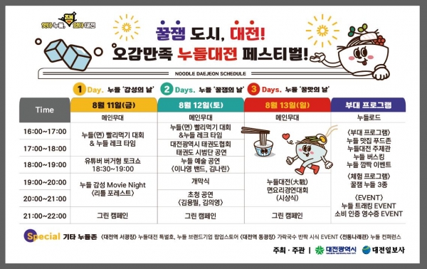 ‘잇다 누들, 잼 있다 대전’이라는 주제로 소문난 누들존, 누들의 부엌존, 추억의 누들존, 누들로드존 등 4개 행사존을 마련했고 다양한 이벤트를 선보일 예정이다.