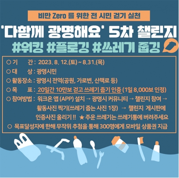 [금요저널] 광명시 보건소는 시민들의 걷기 실천 활성화와 비만 예방을 위해 오는 12일부터 31일까지 20일간 ‘플로깅’으로 2023년 제5회 ‘다함께 광명해요 건강 걷기 챌린지’를 운영한다.