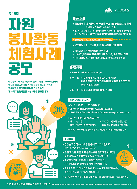 접수기간은 8월 14일부터 10월 6일까지이며 사회복지, 재난재해구호, 환경보호 등 자원봉사활동 모든 분야에서 봉사활동 중 느꼈던 보람과 미담사례 등을 산문 형식 A4용지 3매 내외로 작성해 이메일 우편 등으로 제출하면 되고 기타 자세한 사항은 대구광역시 홈페이지를 참고하거나 대구광역시 행정과에 문의하면 된다.