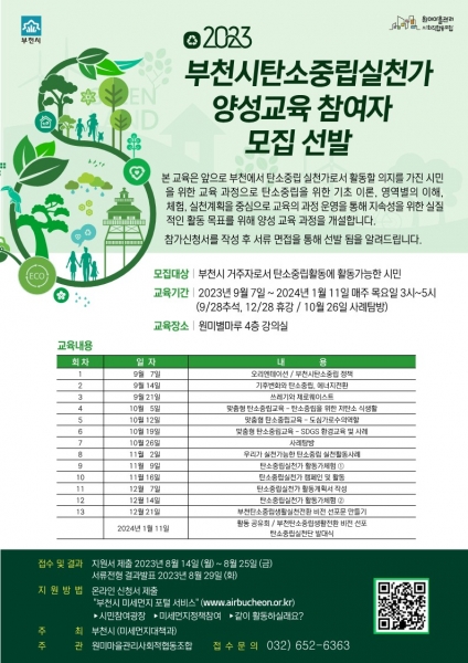 [금요저널] 부천시는 부천시민을 대상으로 ‘2023 부천시 탄소중립실천가 양성교육’ 참여자를 모집해 서류면접을 통해 50명을 선발할 계획이다.