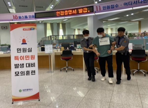 [금요저널] 대전시는 17일 대전시청 소통민원실에서 둔산경찰서와 합동으로 ‘하반기 특이민원 발생 대비 경찰합동 모의훈련’을 실시했다 이번 모의훈련은 폭언·폭행 등 민원응대 과정에서 발생할 수 있는 비상 상황으로부터 방문 민원인과 민원 담당 공무원을 보호하고 피해를 예방할 수 있는 현장 대응능력을 향상하기 위해 마련됐다.