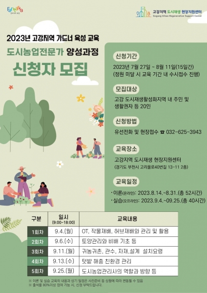 고강지역 도시농업전문가 양성 교육은 고강지역 도시재생 뉴딜사업의 일환으로 지역 특화 사업 발굴을 위한 현장 중심의 인재 역량을 강화해 주민주도형 도시재생 전문 인력을 육성하는 사업이다.
