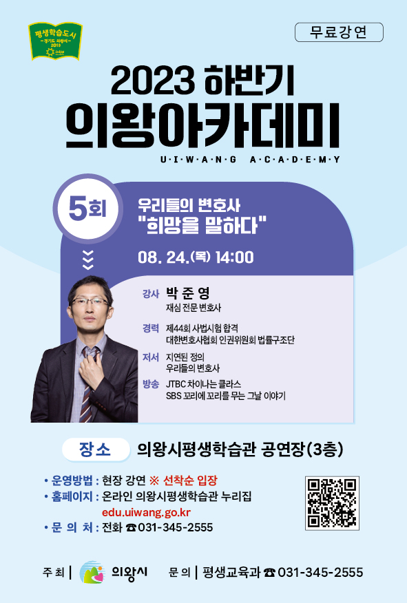 [금요저널] 의왕시가 오는 8월 24일 오후 2시 의왕시평생학습관에서 ‘2023년 제5회 의왕아카데미’강연을 개최한다고 밝혔다.
