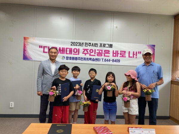 [금요저널] 이천시 장호원읍주민자치학습센터는 21일 다음세대의 주인공이 될 초등학생 8명이 참여한 민주시민 ‘다음세대의 주인공은 바로 나’ 프로그램을 종강하고 수료식을 했다고 밝혔다.
