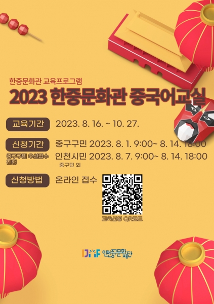 [금요저널] 인천중구문화재단은 한중문화관 활성화 사업의 일환으로 8월 16일부터 오는 10월 27일까지 ‘2023 한중문화관 중국어교실’을 운영한다.