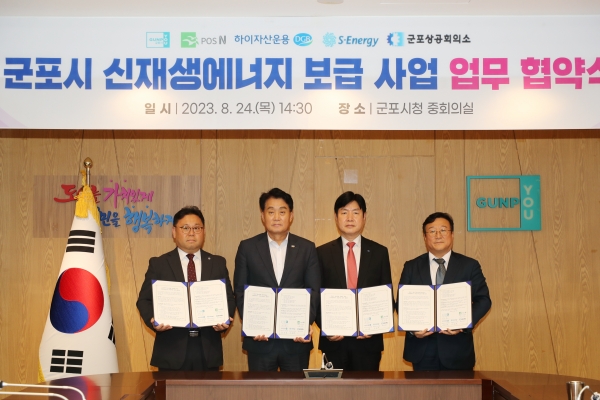 [금요저널] 군포시는 8월 24일 군포시청에서 태양광발전사업자인 포스엔 컨소시엄과 신재생에너지 보급 사업 업무 협약을 체결했다고 밝혔다.