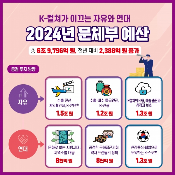 [금요저널] 문화체육관광부는 2024년 정부 예산안이 8월 29일 국무회의를 통과하며 문체부 예산이 6조 9,796억원으로 편성됐다고 밝혔다.