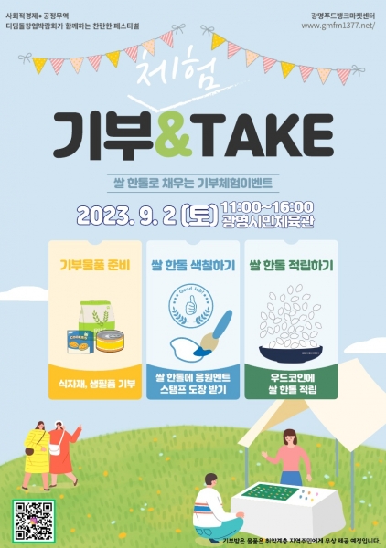 광명푸드뱅크마켓센터는 오는 9월 2일 광명시민체육관에서 개최되는 ‘2023년 광명시 사회적경제 연합페스티벌’에서 시민 누구나 참여할 수 있는 ‘기부&TAKE’ 부스를 운영해 기부 체험의 기회를 제공할 예정이다.
