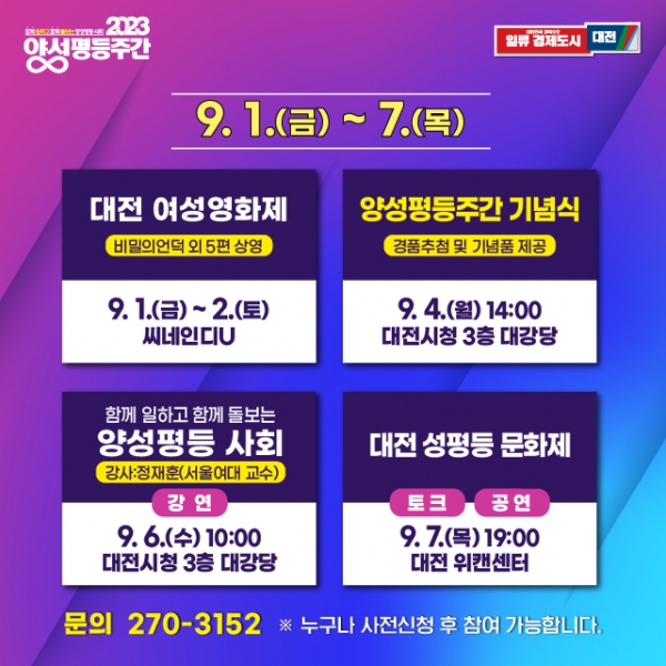 [금요저널] 대전시가 오는 9월 1일부터 7일까지 2023년 양성평등주간을 맞아‘함께 일하고 함께 돌보는 양성평등 돌봄’을 주제로 다양한 양성평등 문화 확산 행사를 개최한다.