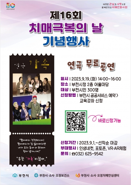 [금요저널] 부천시는 오는 9월 19일 부천시청 어울마당에서 제16회 치매극복의 날을 맞이해 치매인식개선 연극 ‘가족’을 선보인다.