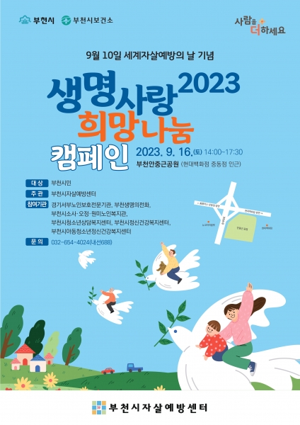 [금요저널] 부천시와 부천시자살예방센터는 올해로 20회를 맞은 세계 자살예방의 날을 기념해 오는 16일 오후 2시부터 부천 안중근공원에서 ‘2023 생명사랑 희망나눔 캠페인’을 진행한다.