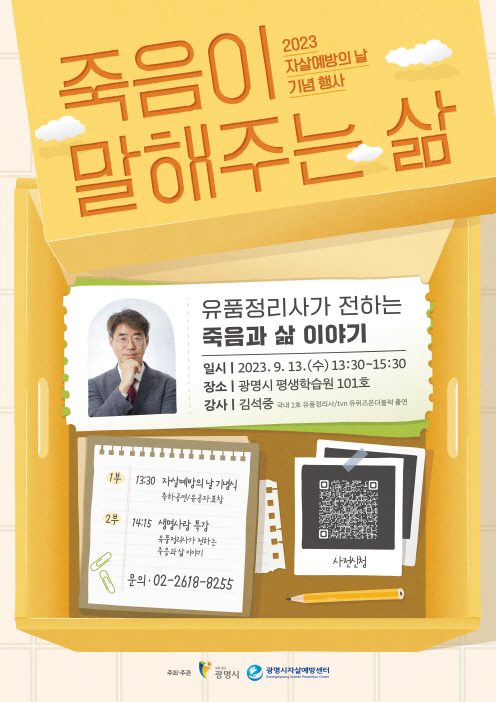 [금요저널] 광명시 자살예방센터는 오는 13일 광명시평생학습원 1층 강당에서 2023년 세계 자살예방의 날 기념행사로 ‘죽음이 말해주는 삶’ 특강을 진행한다.
