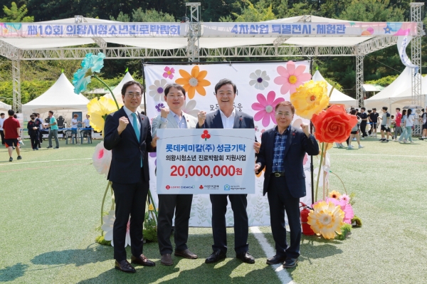 진로박람회 현장에서 진행된 전달식에는 의왕시청소년재단 김성제 이사장, 원억희 대표이사를 비롯해 롯데케미칼 첨단소재사업 HR부문장 문정식 상무, 경기 사랑의열매 김효진 사무처장 등이 참석했다.
