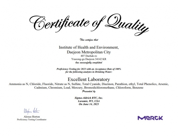 특히 먹는물·수질·토양 분야에서는 세계적인 숙련도시험 운영기관인 Sigma-Aldrich RTC Inc.와 미국 환경자원협회, 미국)에서 주관하는 국제숙련도 프로그램에 참여해 시험·검사 능력의 우수성을 국제적으로 다시 한번 인증받았다.