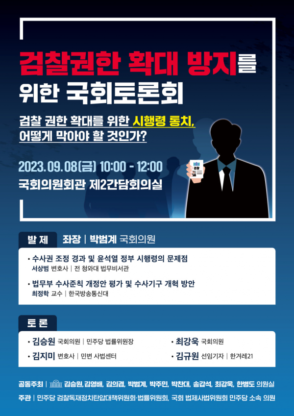 더불어민주당 검찰독재정치탄압대책위원회는 오는 8일 오전 10시 국회의원회관 제2간담회의실에서 ‘검찰권한 확대 방지를 위한 국회토론회’를 개최한다.