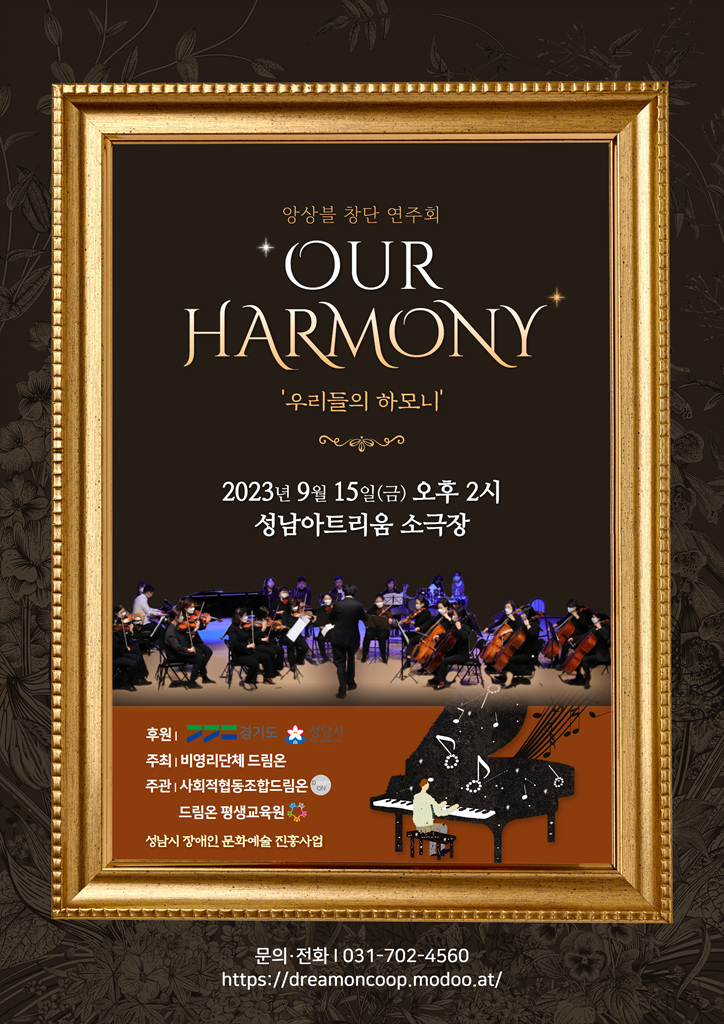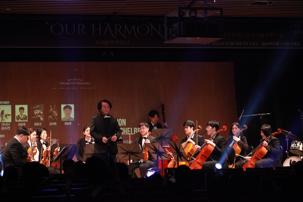 발달장애인 예술교육기관 비영리단체 드림온(대표 김서정) 주최로 열린 앙상블 창단연주회 '우리들의 하모니' 공연이 지난 2023년 9월 15일(금) 14:00 성남아트리움 소극장에서 열렸다. 비영리단체 드림온은 예술에 대한 재능을 발굴하고 극대화하여 향후 직업 예술인으로 성장할 수 있도록 예술 전공자이며 치료사를 겸하는 강사진들로 구성하여 체계적이고 전문적인 교육을 실시하고 있다. 이번 행사는 장애인과 비장애인이 문화예술로 삶을 즐기고 일상에 활력을 불어 넣는 귀중한 시간이 되었다.