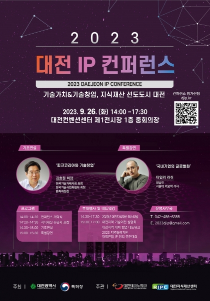 [금요저널] 대전시와 특허청이 주최하고 대전테크노파크와 대전지식재산센터가 주관하는 ‘2023 대전 지식재산 콘퍼런스’가 9월 26일 대전컨벤션센터에서 열린다.