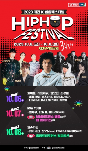 [금요저널] 대전시는 새로운 힙합문화 선도 도시 구축과 원도심 경제 활성화를 위해 오는 6일부터 3일간 ‘2023 대전 K-힙합페스티벌’을 대흥동 우리들공원 일원에서 개최한다.
