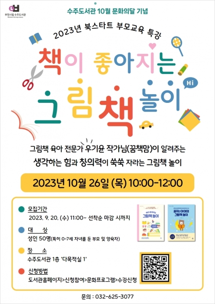 [금요저널] 부천시는 오는 10월 26일 목요일 오전 10시 수주도서관에서 북스타트 부모교육 특강 ‘책이 좋아지는 그림책 놀이’를 개최한다.