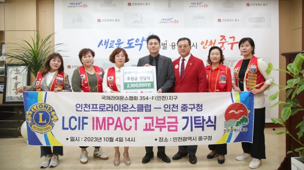 [금요저널] 인천시 중구는 지난 4일 국제라이온스협회 354-F지구 제3지역 프로클럽으로부터 후원금 230만원을 전달받았다고 밝혔다.