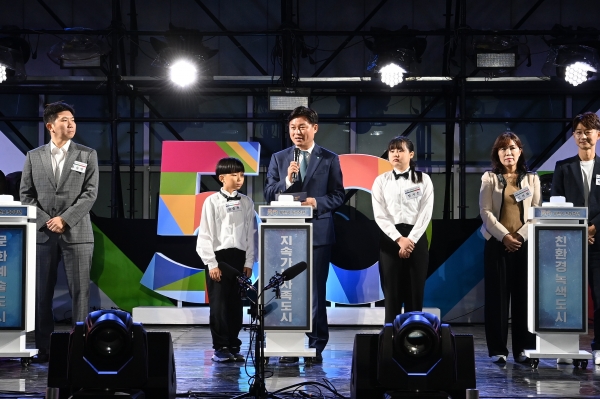 조 시장은 기업·첨단·문화·체육·녹지·환경·교통·어린이 등 분야별 대표 시민들과 무대에 올라 ‘지속가능 자족도시’ 비전을 함께 선포했다.