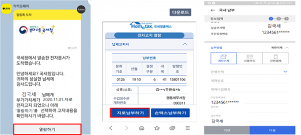 국세청은 2020년 12월부터 카카오톡 또는 문자를 통해 홈페이지와 모바일에 등록된 세금 고지서를 확인할 수 있는 ‘모바일 전자고지’ 서비스를 시행했다.