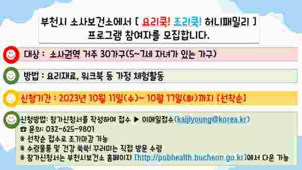 [금요저널]부천시는 10월 11일부터 소사권역 거주 30가구를 대상으로 건강생활실천사업 ‘요리쿡 조리쿡 허니패밀리’ 참여자를 30가구 선착순 모집한다.