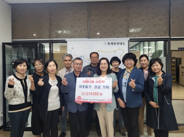 전동주 민간위원장은 “매년 많은 분의 도움이 있지만 특히 올해는 위원님들이 적극적으로 참여하고 많은 시민들이 이웃돕기에 동참해 주신 덕분에 어느 해보다 많은 성금이 모였다”며 “이번 성금이 어려운 이웃에게 조금이나마 힘이 되길 바란다”고 전했다한경숙 동장은 “지역복지발전을 위해 항상 노력해 주시는 협의체 위원들에게 깊은 감사를 드린다”며 “협의체와 함께 복지사각지대 발굴에 앞장서 소외된 이웃이 없는 행복한 청계동을 만들기 위해 최선을 다하겠다”고 말했다한편 청계동지역사회보장협의체는 지역사회복지 발전과 복지공동체 구현을 위해 민관협력의 구심점 역할을 하고 있으며 복지사각지대 발굴에도 최선을 다하고 있다.