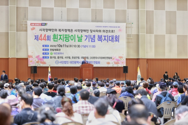 11일 대전 한밭체육관에서 시각장애인 가족과 자원봉사자 등 1,000여 명이 참석한 가운데 2023년 제44회 흰지팡이의 날 행사를 개최했다(사진=대전시)