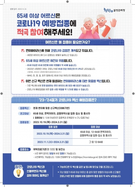 시는 특히 이번 절기에는 인플루엔자와 코로나19 모두에 대한 위험도가 높은 65세 이상 어르신들에게 두 백신 ‘동시 접종’을 권고한다고 설명했다.
