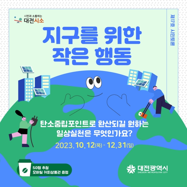 [금요저널] 대전시는 정책제안 플랫폼 ‘대전시소’에서‘탄소중립포인트제가 확산되려면 어떻게 해야 할까요?’와‘반려인과 비반려인, 반려동물의 행복한 공존을 위해 무엇이 필요할까요?’라는 주제로 온라인 공론장을 연다.