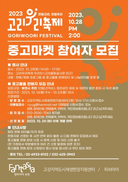 [금요저널] 부천시는 오는 28일에 개최되는 ‘2023년 고리우리축제’에 함께할 중고마켓 참여자를 모집한다.