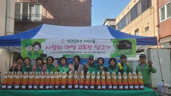 [금요저널] 광명시 광명4동 새마을지도자협의회·부녀회는 지난 17일 동 행정복지센터 주차장에서 ‘2023년 사랑의 매실고추장 나눔’ 행사를 진행해 직접 담근 고추장과 매실청을 관내 독거노인, 차상위계층, 기초생활수급자 등 취약계층 가정 70가구에 전달했다.