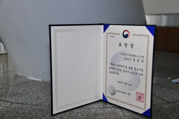 ㈜위드플러스시스템은 중소벤처기업부가 시상하는 경영혁신 분야에서 사회적기업 경영에 탁월한 성과를 내고 경제발전에 이바지한 유공을 인정받아 장관상의 영예를 안게 됐다.