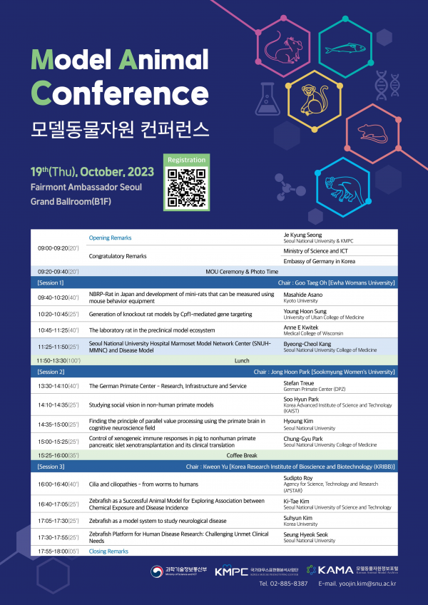 협약식 이후에 개최되는 모델동물자원 컨퍼런스에서는 독일·일본·미국·싱가포르 등의 대표적인 모델동물 연구기관 및 생물자원 연구자 150여명이 모여 랫드, 영장류 및 제브라피쉬 자원 인프라와 연구동향에 대해 공유할 예정이다.