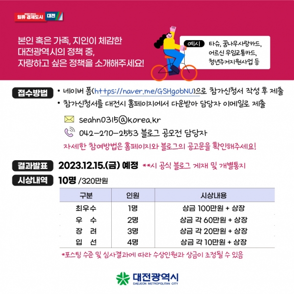 접수 방법은 대전시 공식블로그에서 참가신청서를 내려받아 작성한 후 오는 11월 30일까지 담당자 전자우편으로 보내거나 네이버폼을 이용하면 된다.