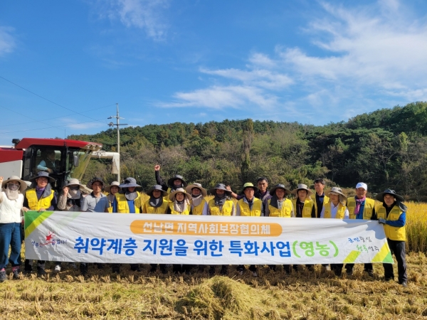 [금요저널] 선남면 지역사회보장협의체위원 20여명은 10월 24일‘특화사업’의 일환으로 도흥리일대에서 벼를 수확하는 행사를 실시했다.