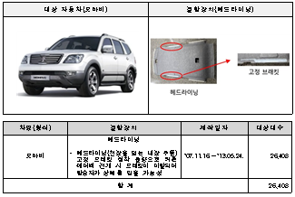 모하비 26,408대는 헤드라이닝 고정 부품 제조 불량으로 11월 1일부터 시정조치에 들어간다.