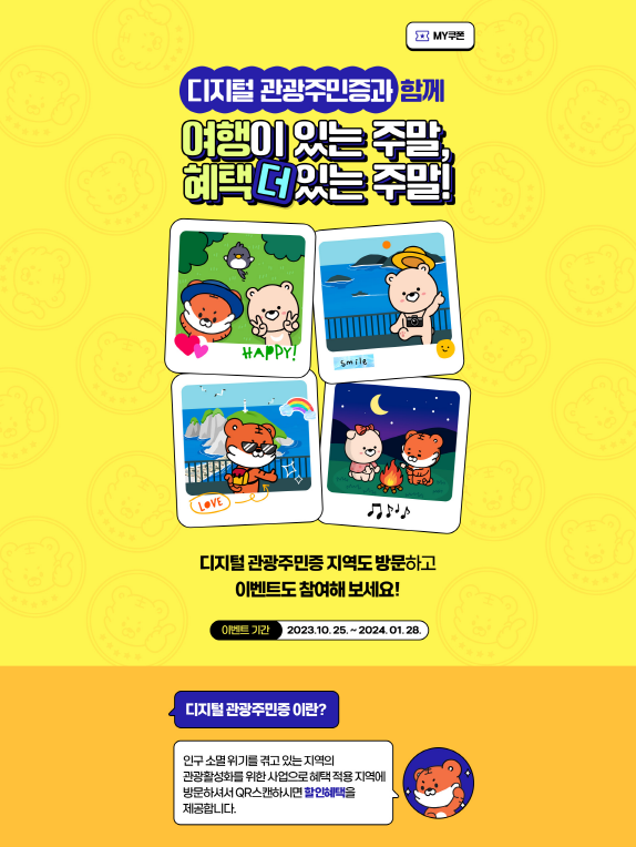 10월 25일부터 내년 1월 28일까지 여행이 있는 주말 동안에는 총 15개 지역에서 디지털 관광주민증을 신규로 발급받는 경우, 지역 대표 관광지에서 사용 가능한 추가 할인권을 제공한다.