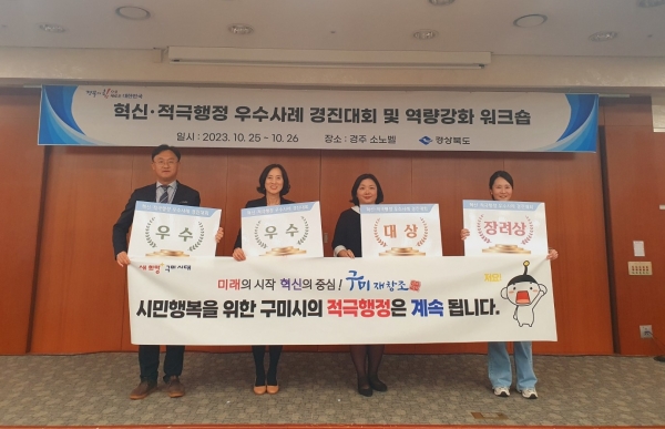 [금요저널] 구미시는 25일 경주에서 진행된 ‘2023년 경상북도 혁신 및 적극 행정 우수사례 경진대회’에서 적극 행정 분야 ‘대상’, ‘우수상’, 혁신 분야 ‘우수상’, ‘장려상’을 받았다.