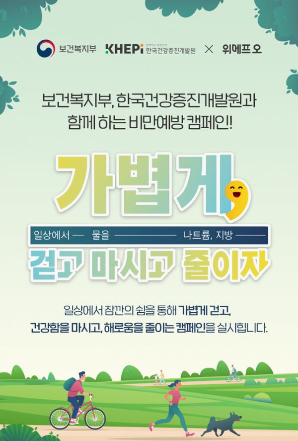 [금요저널] 보건복지부와 한국건강증진개발원은 건강 식생활에 대한 사회적 관심을 환기하기 위해 배달앱 위메프오와 협업해 10월 27일부터 11월 26일까지 한 달간 건강 식생활 실천 캠페인을 운영한다고 밝혔다.