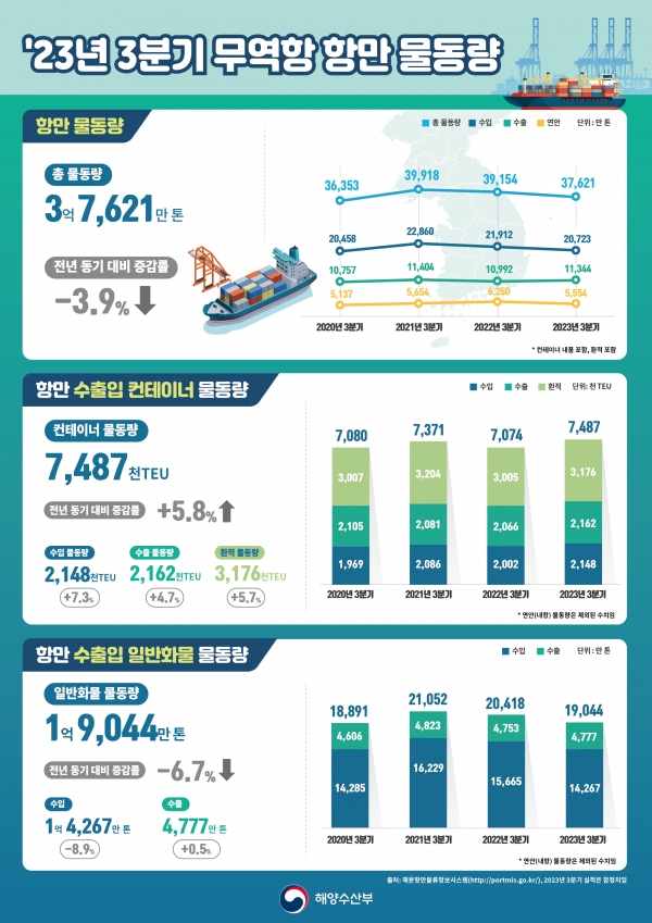 [금요저널] 해양수산부는 2023년 3분기 전국 무역항에서 전년 동기보다 3.9% 감소한 총 3억 7,621만 톤의 물량을 처리했다고 밝혔다.