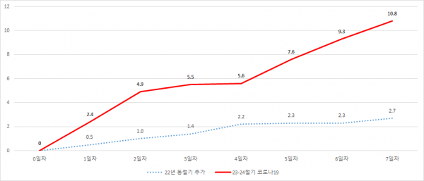 접종 7일차인 10월 25일 오후 6시 기준, 65세 이상 누적 접종자는 1,056,292명이며 누적 접종률은 10.8%로 작년 동기간 접종률의 4배에 달한다.