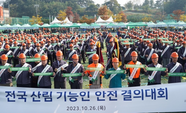 [금요저널] 산림청은 26일 강원도 강릉시 강릉강남축구공원에서 산림청 소속 직원과 국유림영림단 등 산림기능인 1,200여명이 모여 산림사업장 중대재해 예방을 위한 안전 결의대회를 개최했다고 밝혔다.