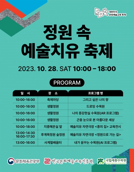 국립세종수목원은 국민 누구나 즐기는 수목원·정원 문화 확산을 위해 한국문화예술교육진흥원과 함께 수목원 인프라를 활용해 이번 축제를 마련했다.