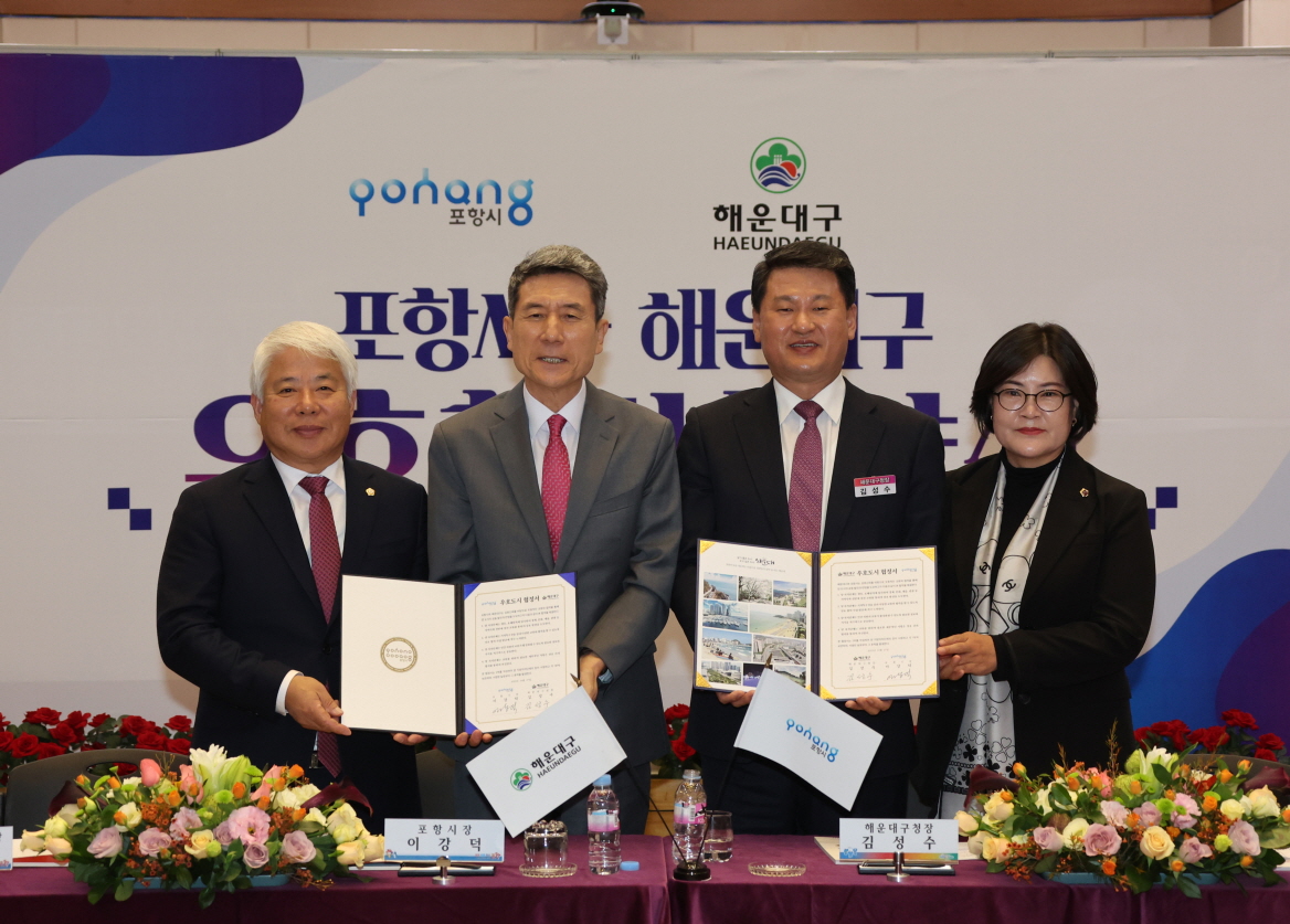 이날 협약식에는 이강덕 포항시장과 김성수 해운대구청장, 백인규 포항시의회 의장, 임말숙 부산광역시의원을 비롯한 양 도시 관계자들이 참석했다.